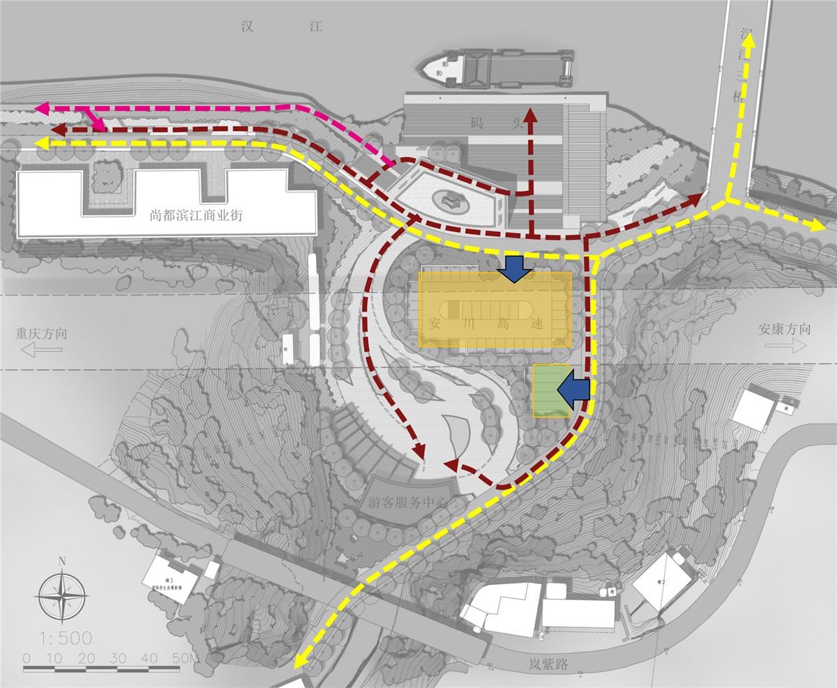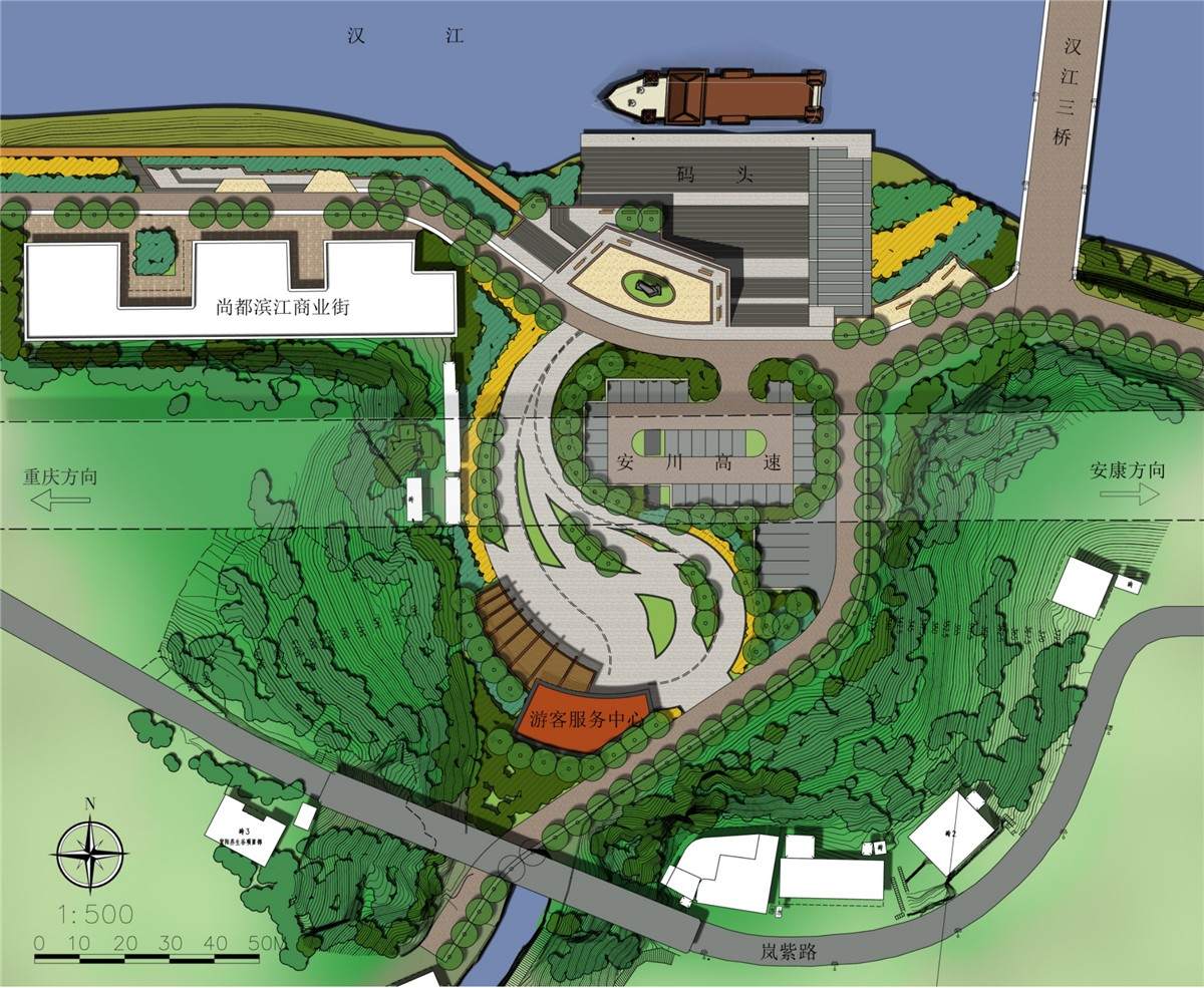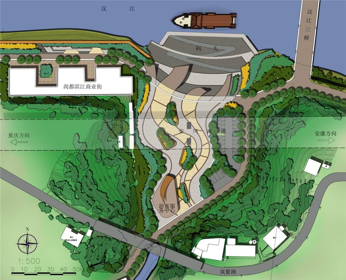 >建设地点:陕西省安康市紫阳县>设计理念:设计理念来源于道教文化核心的“阴阳平衡”太极理论。用一条S曲线将整个广场分为虚实两部分。虚为开敞空间,为人流集散场地;实为绿化停车部分,用地形、绿化植物围合停车位,形成密集空间。另外,S型曲线将码头与游客服务中心相连,两条特色灯带引导人流通往码头。