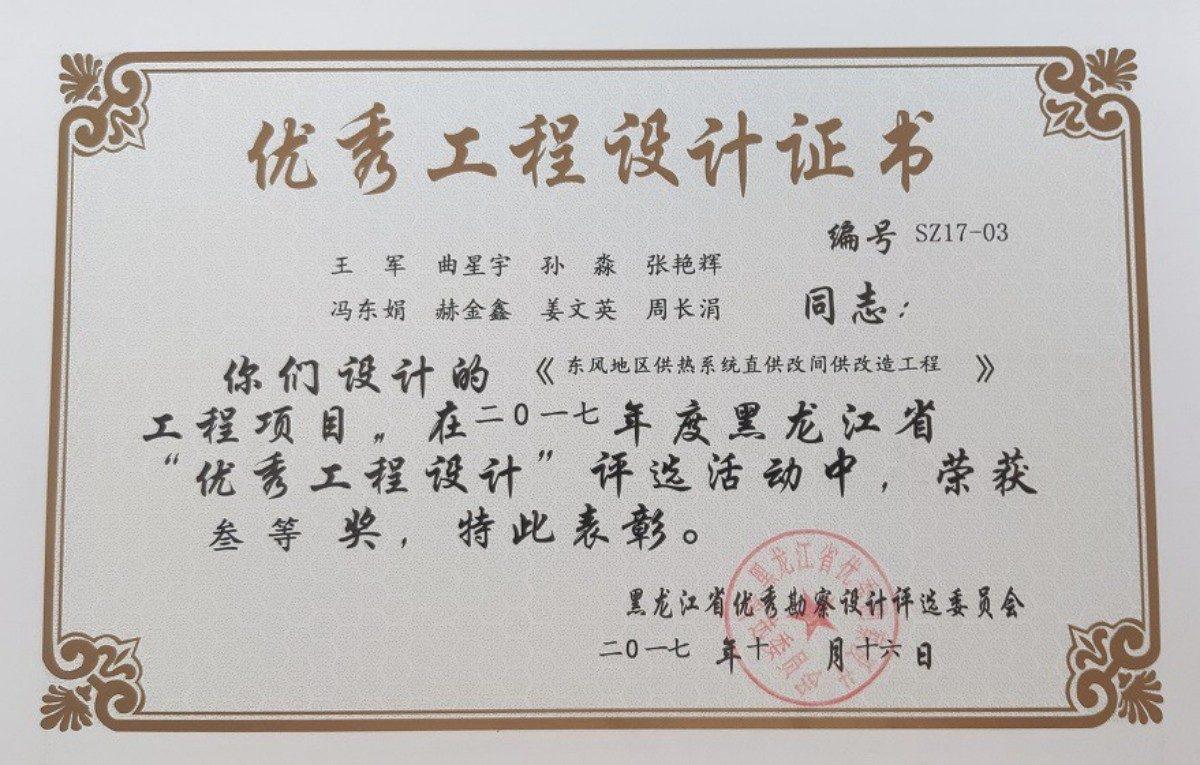东风地区供热系统职工改间供改造工程(2017年度黑龙江省优秀工程设计三等奖)